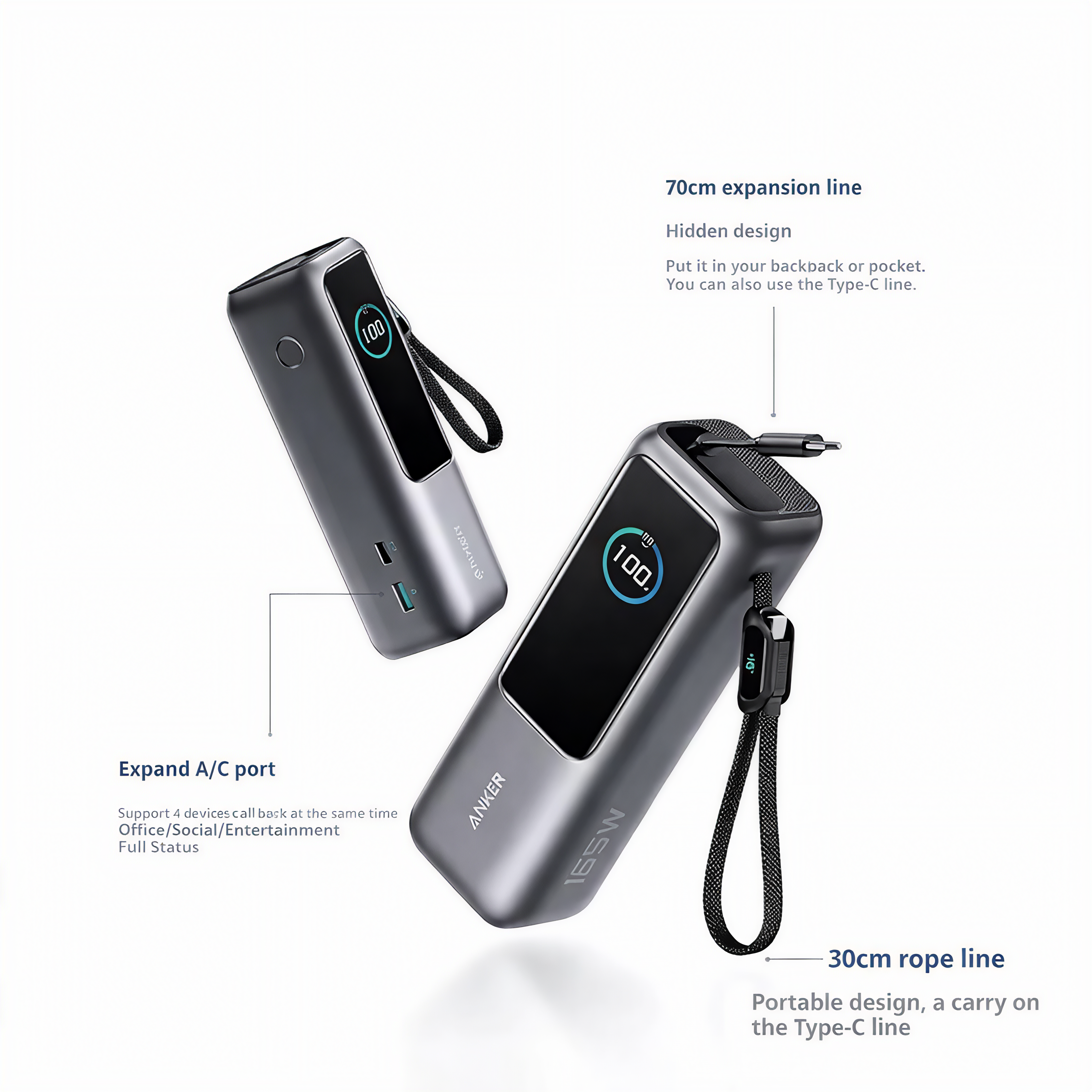25,000 mAh Power Bank, 165W, Maximum Fast Charging, High Capacity, Lightweight Power Bank for Mobile Phones and PCs